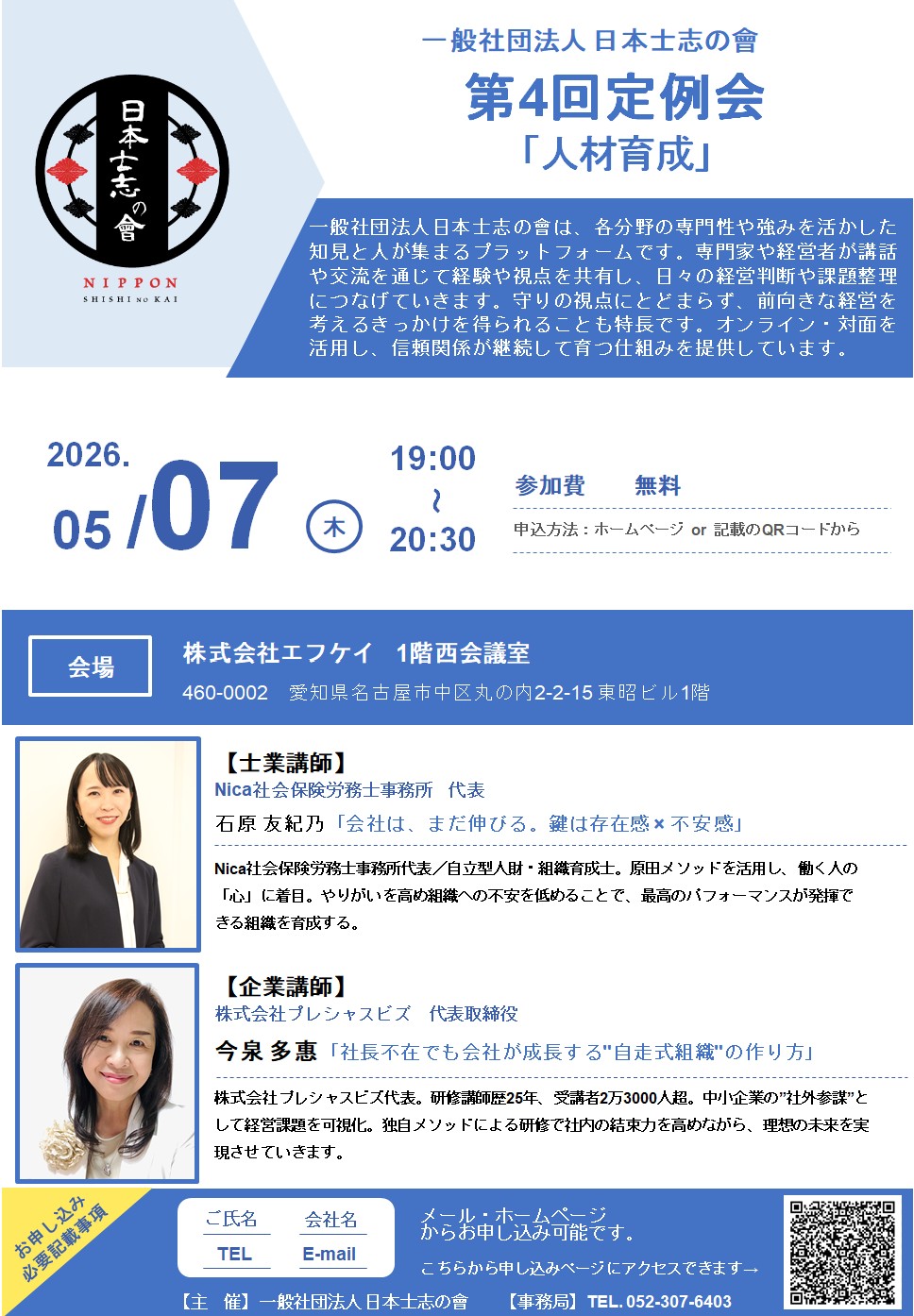 原田メソッドを活用し、働く人の「心」を軸に、やりがいの向上と組織不安の軽減を通じて、自立型人財が活躍する組織づくりを支援しているNica社会保険労務事務所 代表/自立型人財・組織育成士 石原友紀乃氏と、独自メソッドによる研修講師歴25年、受講者2万3,000人超。中小企業の“社外参謀”として、経営課題の可視化と組織の結束力向上を支援し、“自走式組織”の実現を導いている株式会社プレシャスビズ 代表取締役 今泉多恵が講師となり、様々な視点からテーマに基づいた実践的な内容をお伝えしていきます。